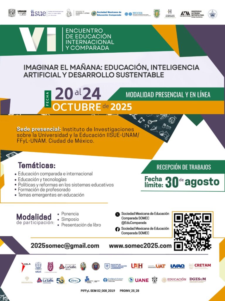 VI Encuentro de Educación Internacional y Comparada: “Imaginar el mañana: educación, inteligencia artificial y desarrollo sustentable” Resumen introductorio Del 20 al 24 de octubre de 2025, la Sociedad Mexicana de Educación Comparada (SOMEC), junto con IISUE?UNAM y FFyL?UNAM, celebrará el VI?Encuentro de Educación Internacional y Comparada. El evento se realizará presencial en Ciudad de México y en modalidad híbrida, con ponencias, simposios y presentaciones de libro.Fecha límite de recepción de trabajos: 30 de agosto de 2025. Temáticas centrales del encuentro Información práctica Fecha: 20–24 octubre 2025Modalidad: presencial en IISUE?UNAM + en líneaLugar: Ciudad de MéxicoRecepción de trabajos: hasta 30 de agosto de 2025Contacto / registro: 2025somec@gmail.com / www.somec2025.com Por qué participar Este encuentro es promovido por la SOMEC con apoyo del IISUE?UNAM, Facultad de Filosofía y Letras, WCCES y múltiples universidades afiliadas, garantizando su enfoque internacional y rigor académico.